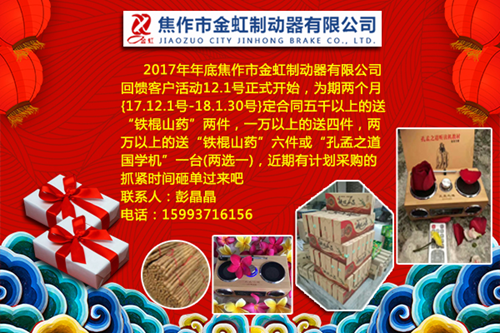 2017年年底焦作市金虹制動器有限公司 回饋客戶活動12.1號正式開始為期兩{17.12.1號-18.1.30號}定合同五千以上的送“鐵棍山藥”兩件,一萬以上的送四件,兩萬以上的送“鐵棍山藥”六件或“孔孟之道國學機”一臺(兩選一),近期有計劃采購的抓緊時間砸單過來吧!